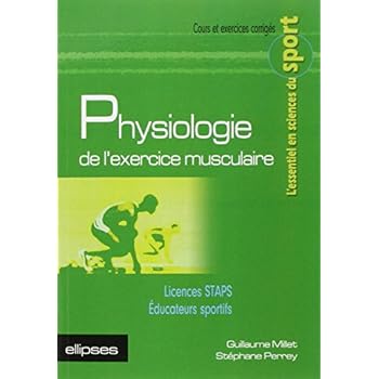 Public Étudiants en licence STAPS (L1-L2-L3) Étudiants en formation d'éducateur sportif Objectifs Acquérir les connaissances de base en physiologie de l'exercice Se préparer efficacement aux épreuves de physiologie de l'exercice Contenu 4 chapitres 40 exercices corrigés 74 schémas 1 glossaire 1 index Sommaire Introduction Le muscle D'où provient l'énergie ? Les filières de resynthèse de l'ATP De l'air ambiant aux mitochondries Les effets de l'entraînementBroché=263 pages. Editeur =Ellipses Marketing (11 janvier 2005). Collection =L'essentiel en sciences du sport. Langue =Français. ISBN-10=2729820205. ISBN-13=978-2729820206. Dimensions du produit=21 x 2 x 14,5 cm. Moyenne des commentaires client =5.0 étoiles sur 5 1 commentaire client. Classement des meilleures ventes d'AmazonMarketing et PublicitéLangues et littératures étrangèresSports=138.063 en Livres (Voir les 100 premiers en Livres) .zg_hrsr { margin: 0; padding: 0; list-style-type: none; } .zg_hrsr_item { margin: 0 0 0 10px; } .zg_hrsr_rank { display: inline-block; width: 80px; text-align: right; } n°696 dans Livres > Entreprise et Bourse > n°1761 dans Livres > Etudes supérieures > Université > n°2137 dans Livres > Sports et passions >.Juste parfait!Reprend exactement tous le cours avec des explications illustrés, graphiques et schémas.Lire et comprendre se livre de 240 pages (connaissance + exercices) vous assurera au moins 16 en physiologie, non négligeable vu le coef.Pour les Non Stapsiens, Juste parfait pour comprendre le fonctionnement du corps et les influences de l'entrainement.